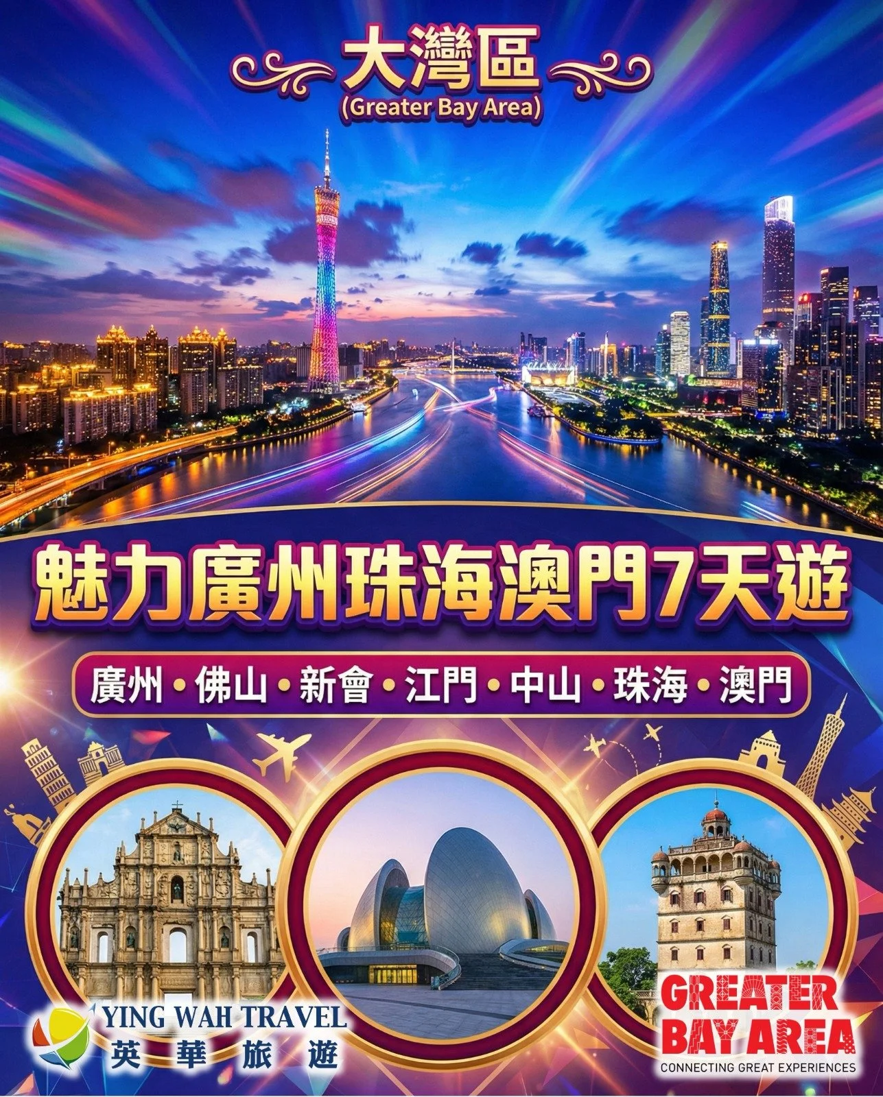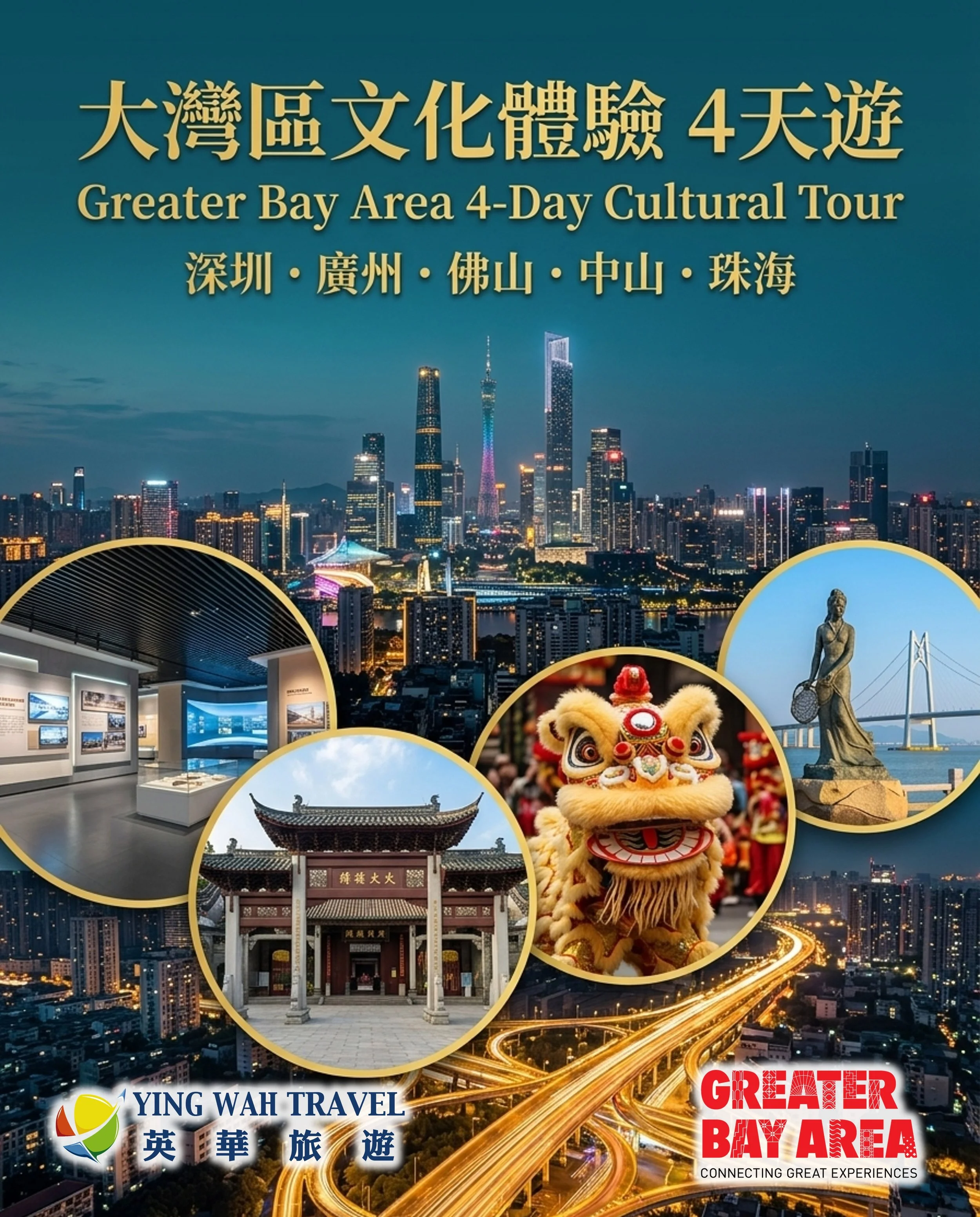 The Greater Bay Area (GBA), situated at the southern gateway of China, is a dynamic international hub connecting Hong Kong, Macao, and nine cities from Guangdong province. The GBA boasts the world's densest concentration of ports and airports and features an extensive, highly convenient transportation network (including the Hong Kong-Zhuhai-Macau Bridge and High-Speed Rail). Seamlessly explore rich Lingnan cultural heritage, modern urban marvels, and unique culinary landscapes. Let Ying Wah Travel guide you through the diverse and accessible wonders of the GBA!